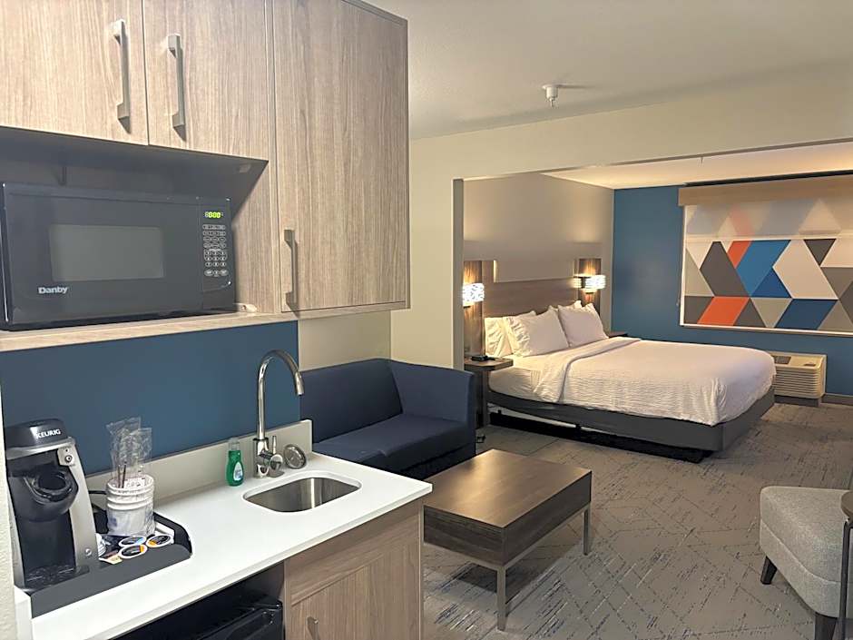 A seating area with sofa bed, counter with sink, microwave and compact fridge are included in this room.